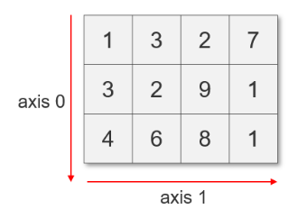 - axis: 배열의 각 축 (ex. 3X4 배열: axis 0[행]과 axis 1[열]을 갖는 2차원 배열. 가로와 세로가 있으면 2차원이다.)