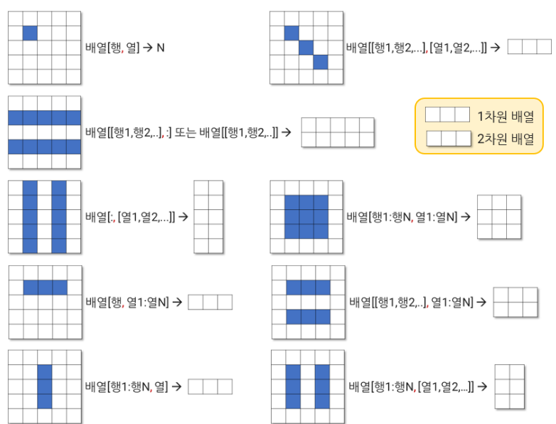- 그 위치의 요소 조회: 배열[행1:행N, 열1:열N]