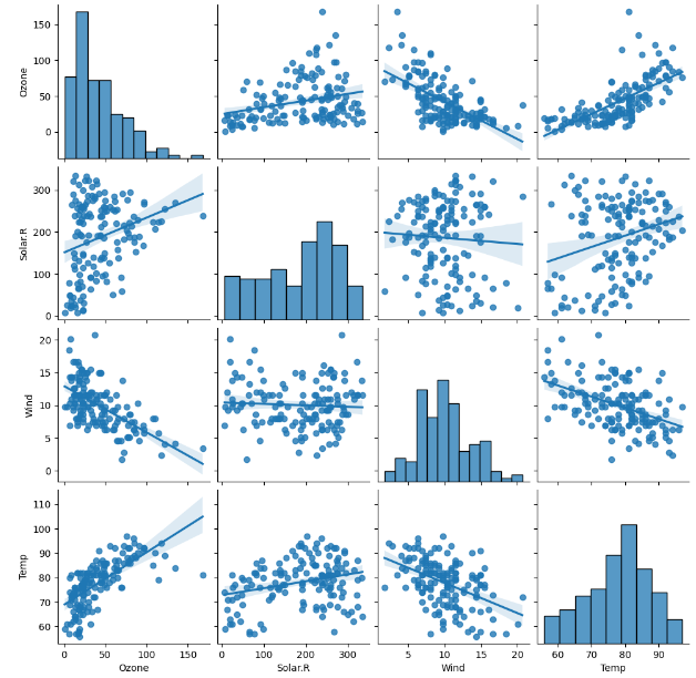 그리고 특정 온도에서 높은 온도가 아님에도 이상치가 확인된다. 이를 통해 온도 외에도 다른 변수가 있는지 확인도 필요할 것 같다. 한편으로는 7-80도에서 다수 밀집된 정보가 확인되는데, 이 온도가 활발하게 오존으로 합성되는 온도인지 확인이 필요하다.