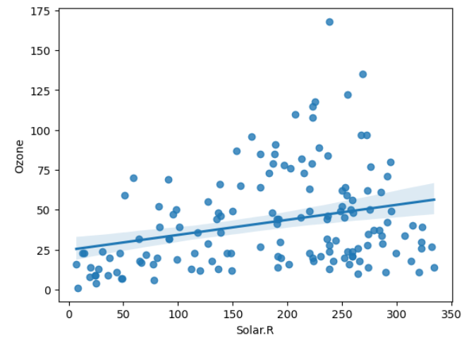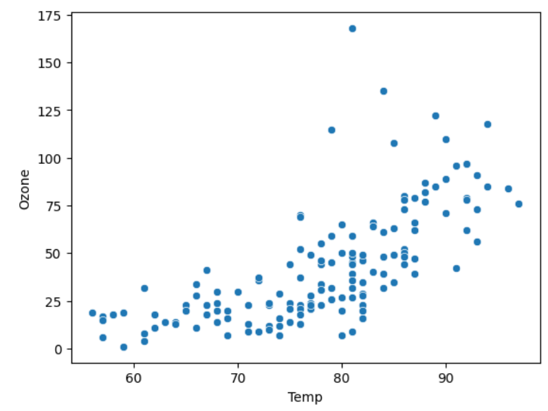 보면, 직선이 보인다. 즉, 온도가 오를수록 오존 농도도 상승하고 있음을 확인할 수 있다. 온도가 올라갈수록 오존 농도의 값의 범위가 점차 넓어지고 있는 것 같기도 하다. 뒤로 갈수록 한 값에 대한 세로 범위가 커진다. 이를 온도가 커질수록 오존 값의 분산이 커지고 있다고 표현할 수도 있을 것 같다.