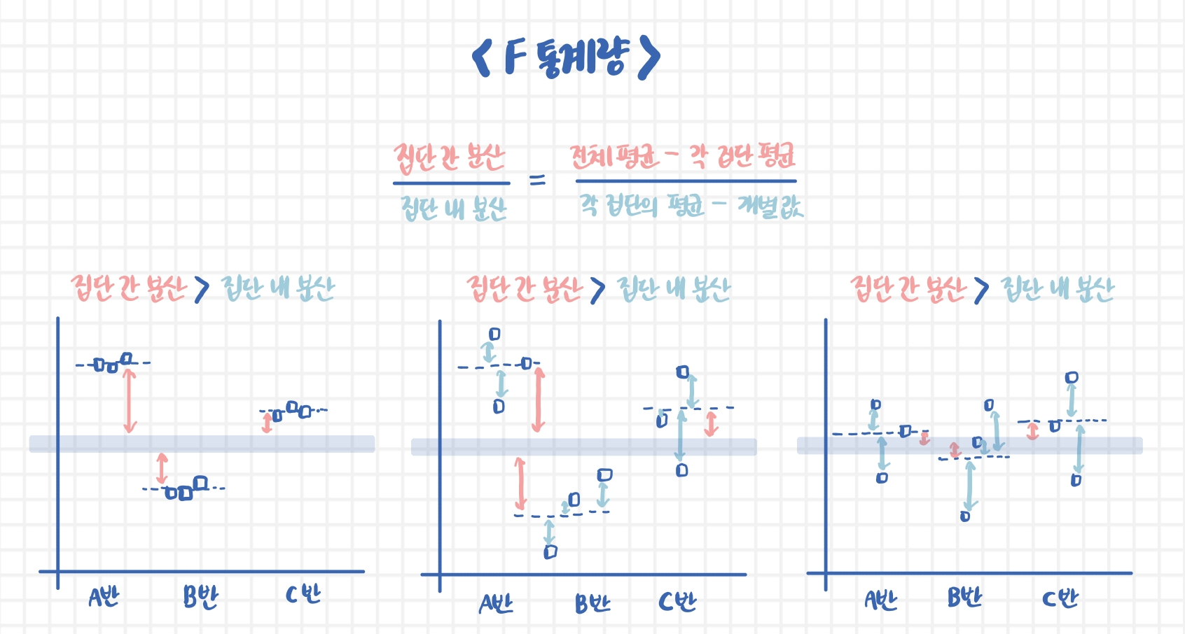 차이라는 것은 빼다는 의미가 강하다. 어떤 기준이 있고, 그것으로부터의 차이이다. a-b면 앞의 것이 기준이다. a가 기준이다? 그럼 a가 기준이다. a를 기준으로 b가 얼마나 차이가 있냐? 하는 것이다. f는 전체 평균이 기준이다. 이 기준으로부터 얼마나 차이가 있냐? 차이값이다.