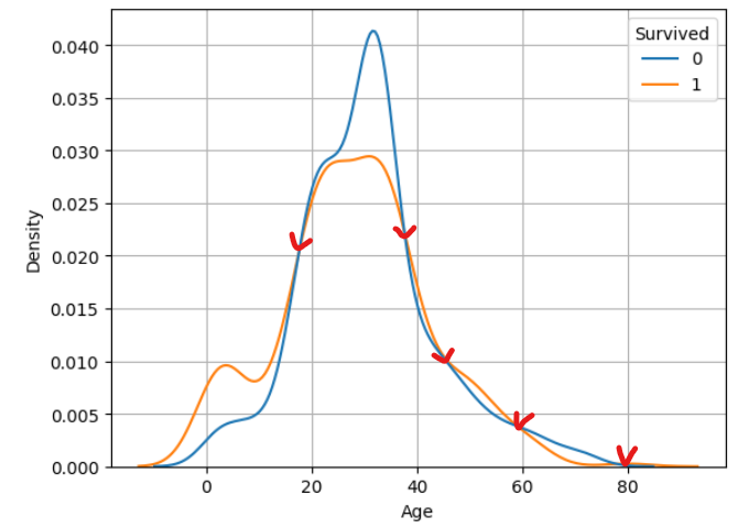 그래프를 보면, 생존자와 사망자 그래프가 만나는 부분이 5군데가 관찰된다. 이 접점을 기준으로 어느 그룹이 더 높게 나타나는지를 살펴보며 의미를 해석해볼 수 있다.