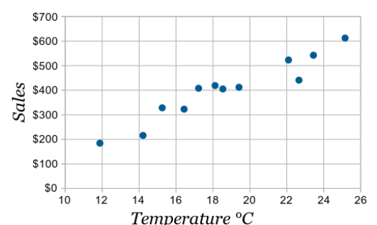 해당 산점도에서 온도와 판매액 간의 어떤 관계가 보이는가? 얼마나 강한 관계인가? 위처럼 숫자와 숫자를 비교할 때 중요한 관점은 직선'이다.
