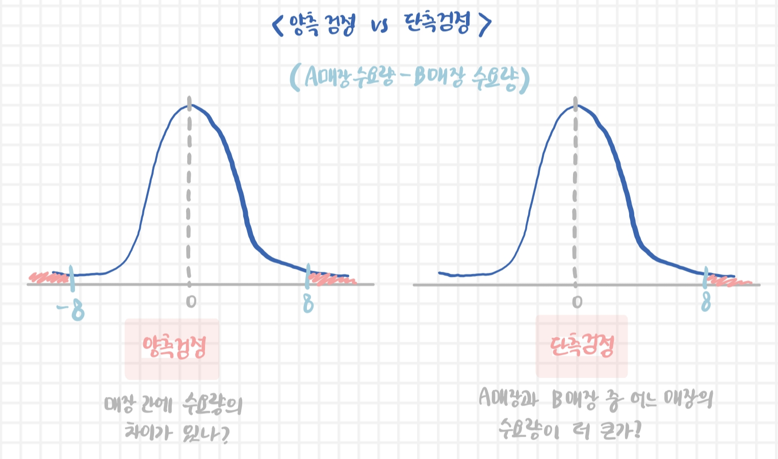 한편, 양측검정과 단측검정을 구분하기도 하는데, 데이터 분석에서는 대부분의 경우가 다 양측검정이니 특별히 신경을 안 써도 된다. 우리는 주로 매장이 어디에 있냐가 판매량과 관련이 있는지 이게 궁금하다. (ex. 주택가에 있는 매장이 판매량이 더 높을까?) 모델링도, 데이터 분석도 다 양측검정의 입장이다. 차이가 있는지, 없는지. 이것만이 관심인 것이다.