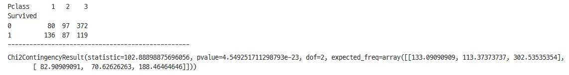 ex. Pclass --> Survived일 때, Pclass 범주가 3개이고 Survived 범주가 2개라면, (3-1) × (2-1) = 2가 된다. 그러므로, 2의 2 ~ 3배인 4 ~ 6 보다 카이제곱 통계량이 크면, 차이가 있다고 볼 수 있다.