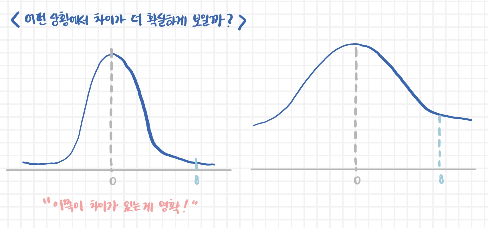 오른쪽 분포라면 왼쪽보다는 차이가 있다, 없다라고 말하기가 애매해질 것 같다. 이처럼 분포가 있으면 어떠한 값에 대해서 판단하기가 더욱 쉬워진다.