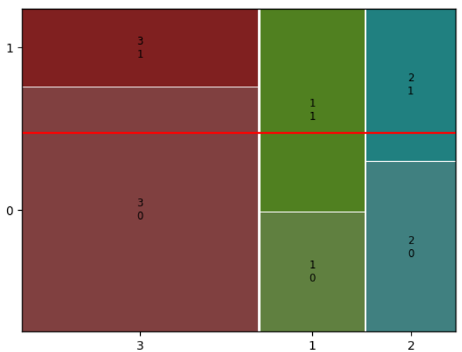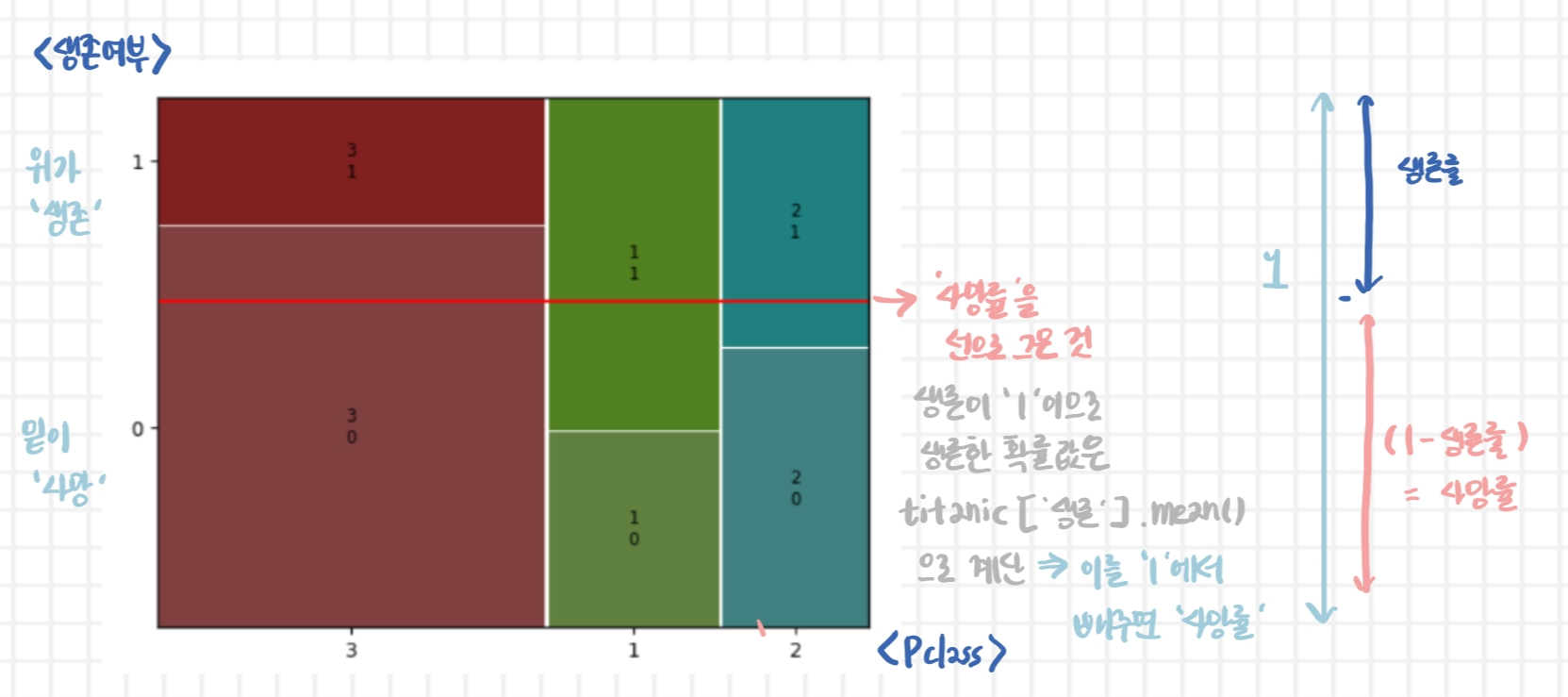 mosaic plot은 범주별 양과 비율을 나타내는 그래프로, 빨간 선은 전체 평균(전체 사망률 or 전체 생존율)을 의미한다.
